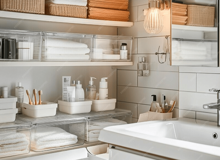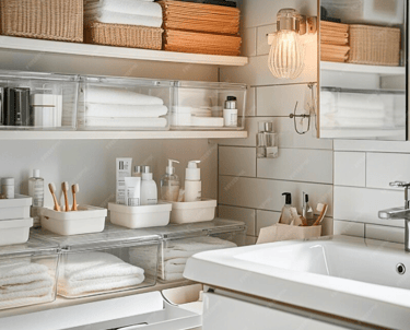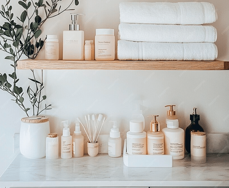 I use stylish, functional containers to store your bathroom items in a way that’s not only organized but also aesthetically pleasing.